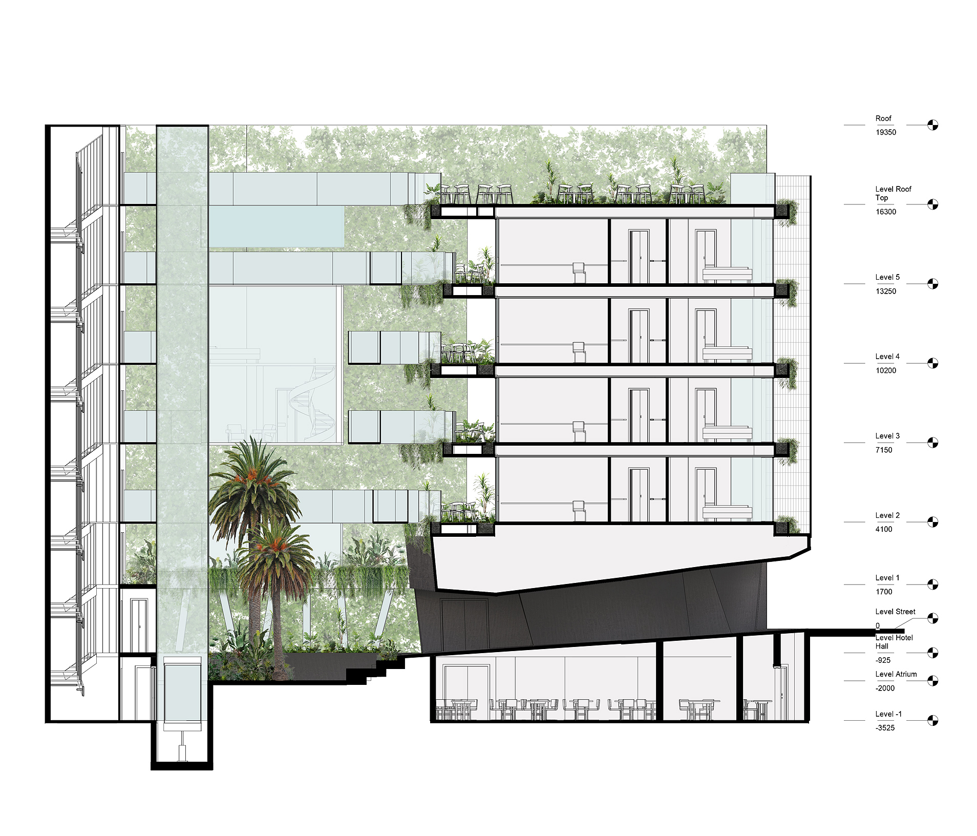 Unapologetic modern architecture of concrete and glass. But made familiar by the dramatic pitched and rendered facades. Open dramatic interiors of voids and volumes, but made intimate by choice and preference. Invasive biophilic design of forests and green walls. But made safe by separation and containment.